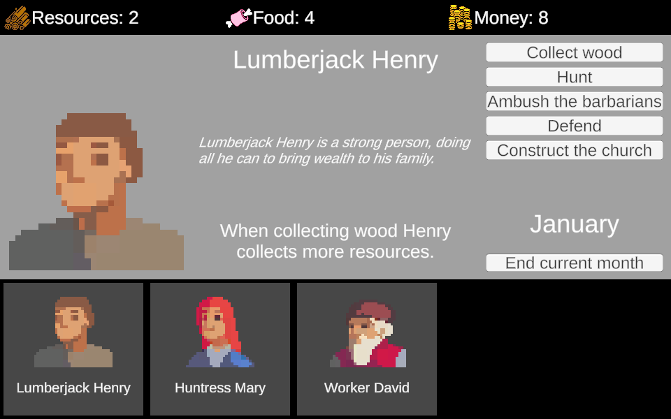 Select a character from the list of characters on the bottom of the screen by clicking it. You will see all the details about the character. Choose an action for them from the menu on the right. If you want a character to do an action, you have to pay them their monthly pay, which is 1 money. Once you select actions for all your characters, click End month to complete the current month. After each month you have to feed your people 1 food.